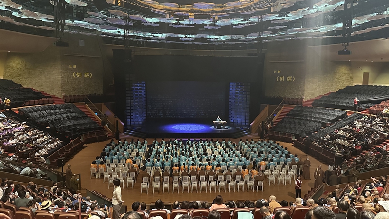 演出當(dāng)天,佛光山大覺堂劇場座無虛席,隨著舞臺大幕緩緩拉開,觀眾們仿佛穿越時空,回到了百年前那個風(fēng)雨飄搖卻又充滿希望的時代。舞臺上,運(yùn)用現(xiàn)代科技手段展現(xiàn)出兩萬多片精心雕刻的佛經(jīng)版組成壯觀的經(jīng)版墻,逼真地還原了金陵刻經(jīng)處的場景,厚重的歷史感撲面而來。新媒體光影舞臺置景,凸顯出超大型光導(dǎo)纖維質(zhì)感的佛像,舞美設(shè)計(jì)巧妙地將科技與傳統(tǒng)文化相結(jié)合,營造出如夢如幻的氛圍,讓觀眾在千年間的文化對話中,感受著中華文化的博大精深。