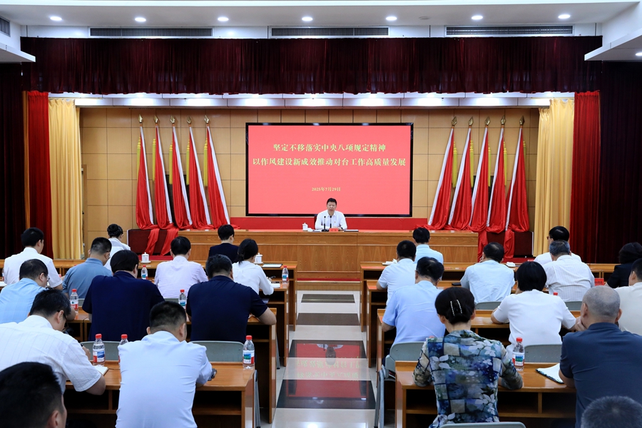 2025年7月29日,中共中央臺辦、國務院臺辦主任宋濤以“堅定不移落實中央八項規定精神 以作風建設新成效推動對臺工作高質量發展”為主題,為全辦黨員干部講授專題黨課。駐部紀檢監察組副組長周煜華出席。