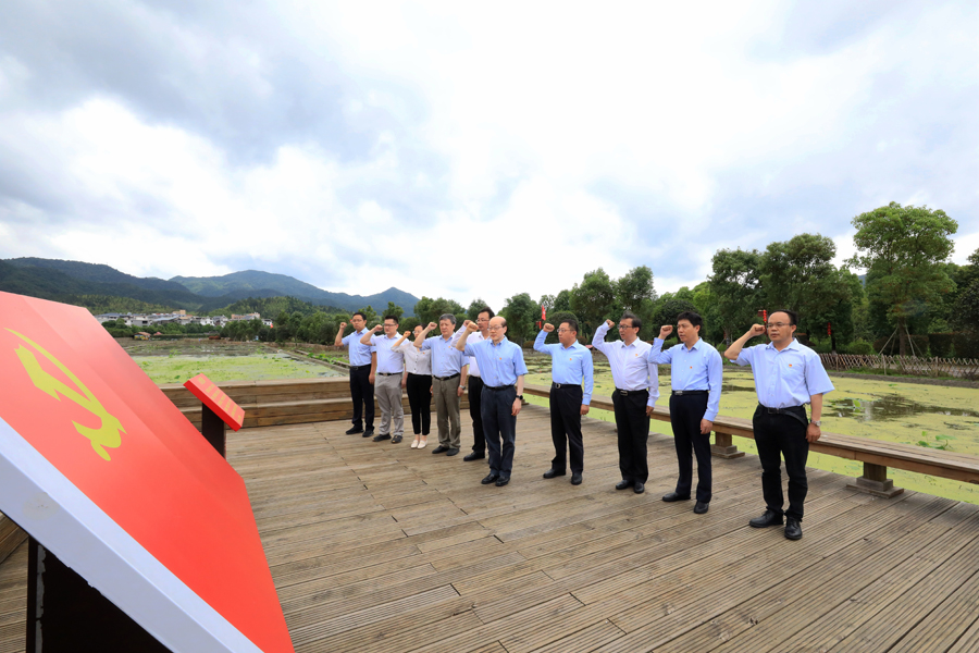 五月的龍巖,萬物欣榮,紅色的土地上孕育著無限生機與希望。劉結一一行先后來到毛主席紀念園、古田會議會址瞻仰學習。在雄壯的《東方紅》背景音樂中,調研組全體黨員向毛主席雕像三鞠躬并敬獻鮮花,繞雕像一周,誦讀毛主席詩詞,感悟中國共產黨人的初心使命。在黨旗前,劉結一帶領調研組全體黨員重溫入黨誓詞,銘記對黨莊嚴承諾,不斷進取,奮斗終身。